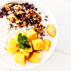 - POUR FABRIQUER DE L’AVOINE À LA BANANE DE COCODans un petit bol, mélanger l’avoine, 1/2 tasse de lait de coco, les graines de chia, la vanille et le sel. Couvrir et placer au réfrigérateur pendant au moins 30 minutes ou de préférence pendant la nuit. (C’est maintenant que je ferais les céréales). Le lendemain matin, versez le mélange , avec 1/2 tasse de lait de coco et assemblerPOUR ASSEMBLER LE BOL.Verser le mélange de flocons d’avoine dans un bol. Garnissez-le de céréales croquantes, de tranches de mangue ou de pêches. Ajoutez de la menthe si désiré.