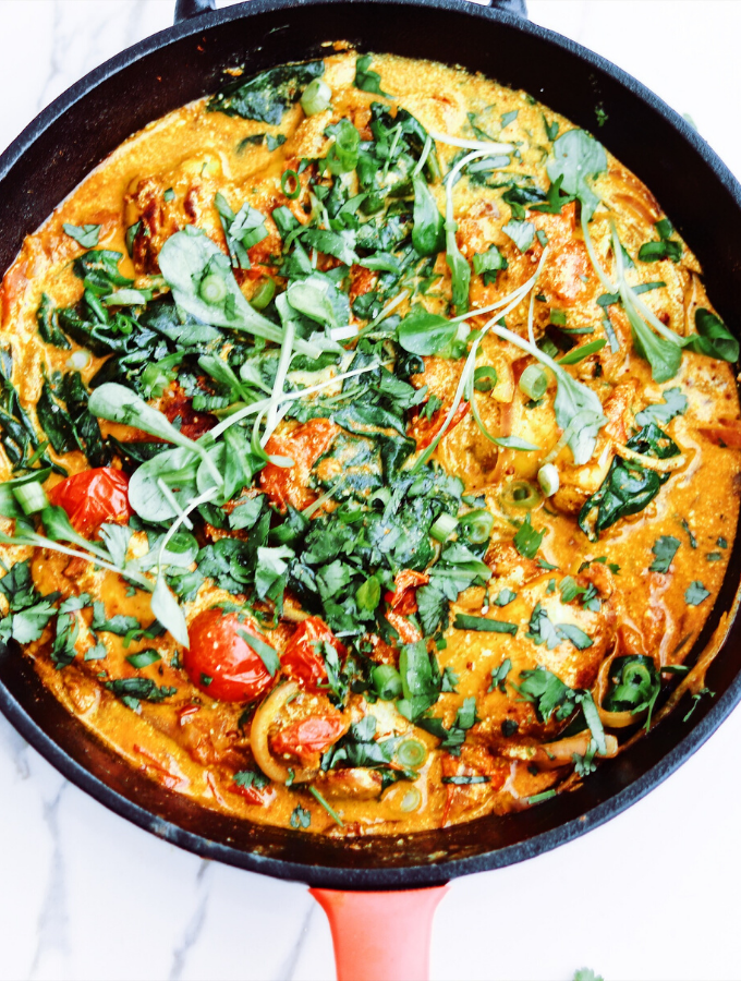 - Réduire le feu à doux et poursuivre la cuisson 8 à 10 minutes supplémentaires jusqu'à ce que le poulet soit bien cuit et que la sauce ait un peu épaissi.Servir sur du riz de chou-fleur ou sans riz tout simplementAjouter au goût oignons vert et coriandre