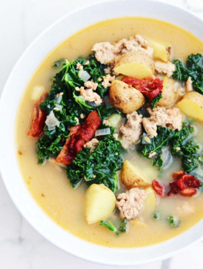 Great zuppa toscana soup, comforting very easy to do. Bacon adds flavor to soup, kale gives it a healthy side and sweet potatoes texture. this recipe is suitable for paleo diets and slimming diets. I cook some slices of bacon in the bottom of the pan to give taste and then I remove the fat. I then use ground chicken and at the end of the coconut milk that gives a delicious touch without being too strong of a coconut flavor.